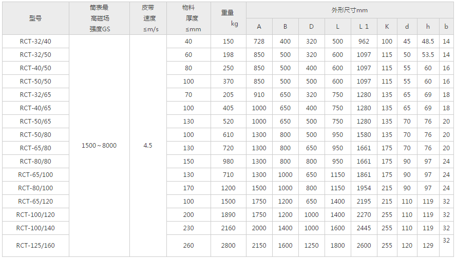 • 產品描述:RCT型全磁滾筒與RCTG係列等同,亦稱磁滑輪或幹式大塊磁選機。其內部采用高性能強磁材料組成強力磁係,具有磁場強度高、大、結構簡單、使用方便、不需要維修、不消耗電力,常年使用退磁率小等特點。