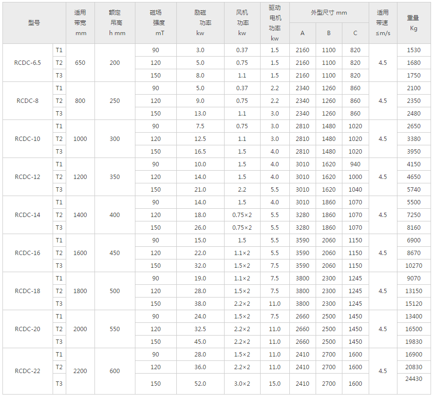 RCDC型風冷電磁成人午夜视频网站,是在RCDA係列除鐵器的基礎上增加了驅動電機、滾筒、帶刮板的卸鐵膠帶等組成的卸鐵機構。在工作過程中卸鐵機構自動將卸鐵皮帶吸附的鐵磁性物質卸到集鐵箱內,無需停電人工清理,實現了除鐵自動化。